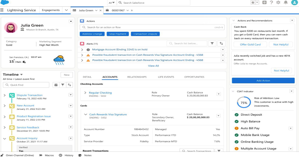 Unify leads, accounts, households, and service history. Surface next-best actions with Data Cloud signals and automation.
